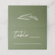 A simple and modern olive green wedding place card, featuring script lettering on the front, and a floral element on the back.