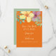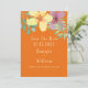 Modern, elegant bright orange wedding save the date invitation with watercolor greenery and giant yellow and purple flowers.