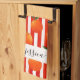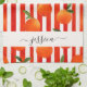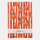 Modern kitchen towel with an orange fruits pattern on red white stripes and a feminine, hand lettered script name. Personalize with your name.