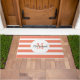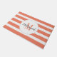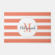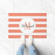 Welcome your guests with this Modern Orange Monogram Script Name Doormat. This minimal design has orange horizontal stripes on white background and circle border on the centre. Your monogram initial is in matching orange simple lettering and personalized with name in grey trendy hand lettered script. Click personalize template option and follow the prompts.