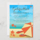 A modern design for a tropical beach party or luau party for a birthday celebration. This design features an orange and cream beach umbrella on a tropical beach with flip flops and bright orange-red flowers with the beautiful blue ocean in the background. The text is fully customizable for your own special occasion.