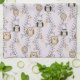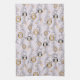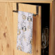 The kitchen towel features a pattern of several cheerful owls in cool, modern colours among floral vines.