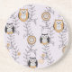 The coaster features several cheerful owls in cool modern colours among floral vines.