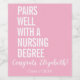 Cheers to you, nursing graduate! We’re celebrating your remarkable achievement with a special bottle of wine adorned with a personalized, funny label. The design features a blush pink background with bold white text that reads, "Pairs Well With a Nursing Degree." Below, "Congrats, [Name]!" is elegantly scripted in calligraphy, and "Class of 2024" is displayed in sleek, white block letters at the bottom. This customizable label lets you adjust the design to perfectly match the occasion. Celebrate their outstanding success with this unique and memorable wine label!
