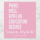 Cheers to you, education graduate! We’re celebrating your outstanding achievement with a special bottle of wine featuring a personalized, playful label. The design features a blush pink background with bold white text that reads, "Pairs Well With an Education Degree." Below, "Congrats, [Name]!" is elegantly scripted in calligraphy, and "Class of 2024" is displayed in sleek, white block letters at the bottom. This customizable label allows you to tailor the design to perfectly match the occasion. Celebrate their impressive success with this unique and memorable wine label!