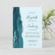 The left-hand edge of this elegant modern wedding invitation features a teal watercolor agate border trimmed with faux silver glitter. The customizable text combines handwriting, copperplate and italic fonts in dark teal on a pale teal background. The reverse side features a matching teal and silver agate design.