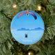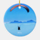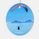 A serene image of paragliding against a bright blue sky. Personalize this with a name and a date on the reverse. A silhouette of a pilot with a red and grey kite, high above the mountains. It's a tranquil and exhilarating image.
