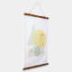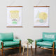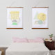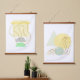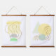 A pair of wood topped tapestries featuring modern abstract shapes in pastel colours with a freeform gold line overlay