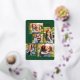 This stylish five photo collage Christmas card features modern typography reading, PEACE, JOY, and LOVE in real gold foil over a dark green background (the colour can be customized to any colour you'd like). The back of the card contains a matching faux foil Christmas trees pattern over a custom colour background (shown in white).