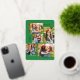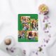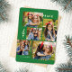 This stylish five photo collage Christmas card features modern typography reading, PEACE, JOY, and LOVE in real gold foil over a bright green background (the colour can be customized to any colour you'd like). The back of the card contains a matching faux foil Christmas trees pattern over a custom colour background (shown in white).