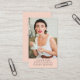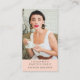 This business card features a professional photo, suitable for many professional titles that require a stylish feel, like fashion stylist, fashion designer, personal stylist, model, or other creative professionals. The background is a peach pink hue. The reverse side features the contact info, social media and QR code. The background is a subtle sage green. Replace this photo with your own creative image.