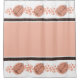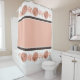 Stylish bathroom shower curtain done in peach, black and white. Watercolor graphic paint splotches and black line leaves are accented with polka dots as a finishing touch.