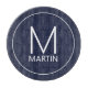Modern minimalist design features personalized monogram and name in white modern sans serif font style on navy blue background.