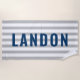 Personalized beach towel design features custom text in simple and modern all caps lettering that can be personalized with a first name. Navy blue text contrasts a striped light cool grey and white background with a stylish pattern of horizontal stripes. Colours and font style can be completely customized.