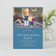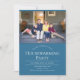A housewarming invitation with customizable text. The photo is a template and meant to be swapped out for your own. The invitation has a blue background and white text.