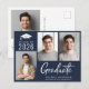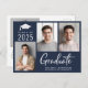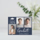 Modern dark blue graduation announcement postcard featuring 3 photos and "Graduate" in a contemporary bold white script. Add the grad's name, class year and high school or college in simple white typography.