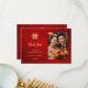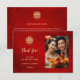 This elegant Chinese wedding thank you card features a custom photo and a golden happiness photo on a shimmering red background.
