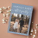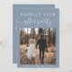 Modern dusty blue elopement or private wedding announcement with a reception invitation. The front features your photo and "Happily Ever After Party" in simple white typography and a chic white script with swashes. On the back, personalize your message and the party or reception invitation details and add your names in a signature-like script.