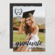 Congratulations the graduate! This trendy, elegant grad party invitation features the photo of the graduate. On the front there is elegant script "graduate" along with the grad's name, school, and class year. On the back is the editable text for your party information. A stylish and simple graduation invitation that will highlight your grad's favourite personal photo!