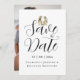 Make your wedding truly unforgettable with this playful dinosaur-themed “Save the Date” card featuring a charming T-Rex bride and groom in soft watercolor style. Designed for fun-loving couples, this unique card blends whimsical romance with modern elegance, pairing the adorable dinosaur illustration with stylish script typography for a memorable first impression.