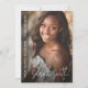 Photo announcement card featuring your photo with the name of the graduate in a modern, white script font and the name and year aligned to the left over a dark overlay. Additional photo and custom message on the back.