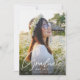 This trendy, elegant graduation party invitation features an earthy rustic photo of the graduate, with trendy modern white script along with the grad's name, school, and graduating class year. The back of the invitation contains all party information and location. Replace the sample photo with your own grad photo.