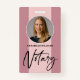 Modern, trendy Notary photo badge features single photo, contact details on a rose gold and blush pink background. Personalize further with your details and logo.
