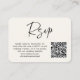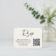 Modern light cream wedding RSVP enclosure card featuring "Rsvp" in a chic script. Input your wedding website address to create a QR code that guests can scan to RSVP online. The back features your photo overlayed with your names and wedding date.