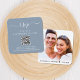 Chic dusty blue wedding RSVP square enclosure card with "rsvp" in an elegant white script with swashes. Input your wedding website address to create a QR code for guests to scan to RSVP online. The back features your photo overlayed with your first names and wedding date joined together by a heart.