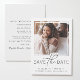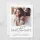 Clean and simple save the date announcement card featuring your photo with an inner square frame cut out and minimal modern typography with a touch of elegant script. Personalize with your first names, wedding date and location. On the reverse side, customize your save the date details and add your names in a signature-like script.