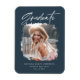 Modern photo typography graduation announcement magnet. Featuring stunning script text and textured effect photograph. Navy blue colour can be customised.