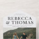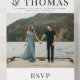 A modern type with large names and a full bleed photo centre panel photo are the features on this all in one wedding invitation with tear off response card.