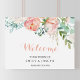 This modern pink blush tropical floral welcome wedding poster is perfect for a destination wedding. The design features beautifully hand-painted white, pink, blush flowers with green leaves, depicting grace and elegance.