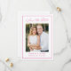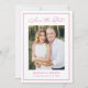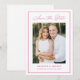 Announce your wedding with this modern photo wedding save the date featuring pink script lettering and a matching pink border that frames the design. “Save the Date” is displayed at the top in calligraphy, with your vertical photo centered and your names, wedding date, and location shown below in classic lettering. This pink wedding save the date is perfect for spring and summer weddings, garden weddings, and romantic wedding styles. The back is blank, allowing space for a wedding website, additional photos, or personalized details.