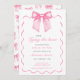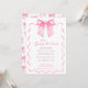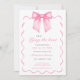 Tying the Knot Pink Bow Bridal Shower Invitation with a watercolor bow at the centre framed by a scalloped ribbon. Beautiful and elegant script with the phrase "She is tying the knot" combined with an art deco type and an elegant type for the details