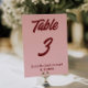 Modern and elegant whimsical pink and deep red wedding table numbers. As you see it features a blush pink background with bold burgundy script that matched the whole suite.