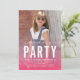 Modern Photo Birthday Party Invitation featuring the words "birthday" in a relax script above a bold "Party" in white against a partly transparent pink with confetti gradient overlay on the front and pink diagonal stripes design on the back side.