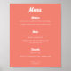 Modern Pink Coral Script Wedding Menu Sign. Customize with your menu items in three categories plus drinks. Feel free to change fonts, background colours, text colours, etc., by clicking on "personalize this template," then "edit using design tool." Please message the designer if you wish to have changes done for you.