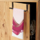 A modern, trendy design on a kitchen towel. The background has an image of sparkling pink glitter drips, along the top. The rest of the background is a delicate pastel pink colour gradient. A pair of high heel pink stilettos add a stylish fashionable vibe.