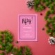 Celebrate in style with our modern and elegant invitation. A striking pink background is accented with a dazzling real gold foil "Fifty!" heading and a luxurious gold foil frame that surrounds your chic party details. Simple, sophisticated, and perfect for the milestone birthday. Created by Simply Farmhouse Press.