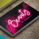 This striking beauty business card design exudes confidence and style with its deep black background and vibrant magenta smoke accents that create a bold, high-energy aesthetic. The glowing neon script "beauty" takes centre stage, conveying creativity and modern appeal, while the clean sans-serif contact details maintain a polished, professional look. Ideal for beauty professionals offering hair, makeup, nails, and lash services, this design attracts trend-conscious clients looking for expert care in a chic and edgy atmosphere, making it a perfect fit for salons, stylists, and beauty entrepreneurs.