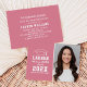 Announce your high school or college graduate in style with this graduation announcement and party invitation. Two-sided card features a senior portrait of the graduate with grad cap and simple and modern white typography design. The pink background can be changed to a different colour with the "Customize It" feature, then Edit / Background to select another colour.