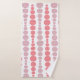 This towel set has a mid-century modern design of pink and lavender rounded rectangles in increasing and decreasing size running vertically on a field of white.