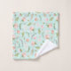 Beautiful pink rose bud floral pattern bathroom towel set on a pale green stripe background.