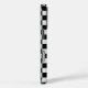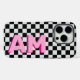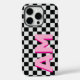 Modern Pink Shadow Monogrammed Personalized Vertical Big Initial Chequerboard iPhone 16 Pro Case - This trendy black and white chequered phone case has large pink vertical shadow monogram on the side which you can customize to make this phone case one of a kind.