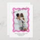 This modern wedding thank you card features a wavy transparent frame in bold pink surrounding your photo, paired with elegant script typography. The unique frame design adds a fun and contemporary twist while keeping the layout clean and stylish. On the back, it includes a pre-written thank you note that you can keep as is or replace with your own words. Personalized with names and wedding date, it’s the perfect way to share gratitude with loved ones in a memorable design.