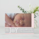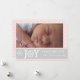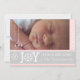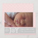Modern pink, white chevron grey Christmas holiday elegant and stylish flat photo card featuring light pink and white chevron zigzag pattern, a grey band with your text “Joy Peace and Love” with a snowflake in place of the letter "O" in the word joy, your names and two hanging white Christmas ornaments or balls .