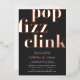 Modern and minimalist engagement party invitations feature chic black and white styling with "pop fizz clink" in oversized rose gold foil retro lettering. Personalize with your engagement celebration details beneath. Invitations reverse to a pattern of colourful stars.