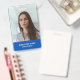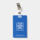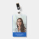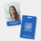 Modern, simple and professional business employee badge on blue background with white typography to match your custom logo features the employee's photo and professional title or department on the front and Business Logo and additional information in the back.