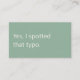A modern, minimalist business card perfect for freelance proofreaders. The front features a soft green background with the apt phrase "Yes, I spotted that typo" in off-white text. The reverse has an off-white background with dark charcoal grey text and space for your contact details. All text on the card is fully editable.